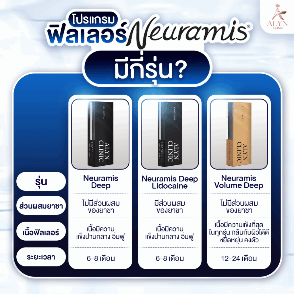 ฟิลเลอร์ Neuramis มีทั้งหมด 5 รุ่น แต่มีแค่ 3 รุ่นที่ได้รับรองความปลอดภัยจากองค์การอาหารและยาประเทศไทย ดังนี้